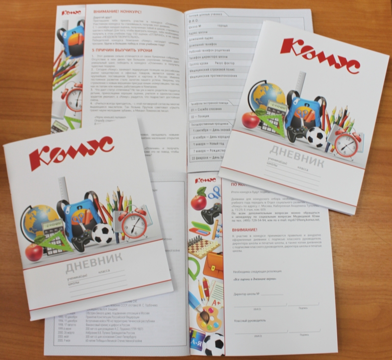 Чтобы сделать учебный процесс детей сотрудников Компании увлекательнее, стимулировать ребят учиться лучше и радовать родителей отличными отметками, «Комус» решил ежегодно проводить конкурс «Отличник» для детей сотрудников, школьников с 1 по 11 класс. Приятным дополнением и знаком отличия для юных конкурсантов стал стилизованный дневник с логотипом Компании (каждый новый учебный год у него новый дизайн!), также к участию в конкурсе принимались все дневники.