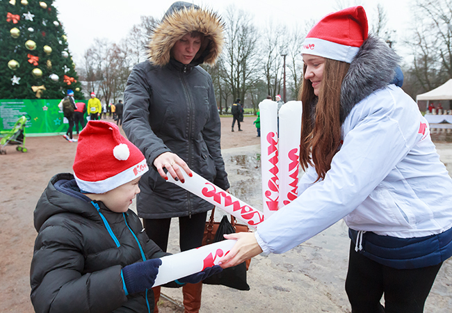 На финише новогоднего спортивного марафона спортсменов ждали горячий чай, зажигательная музыка и, конечно, Дед Мороз! Маленьких гостей пробега развлекали аниматоры в костюмах белого мишки и зайца. Всем участникам мероприятия на память были вручены сертификаты и значки, а победители получили медали и ценные подарки от «Комуса».