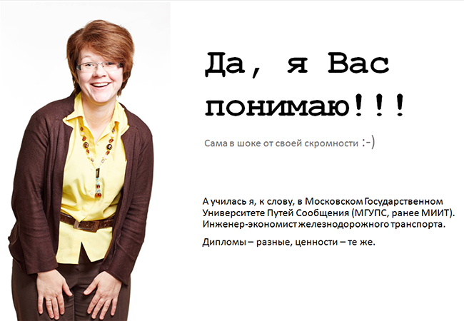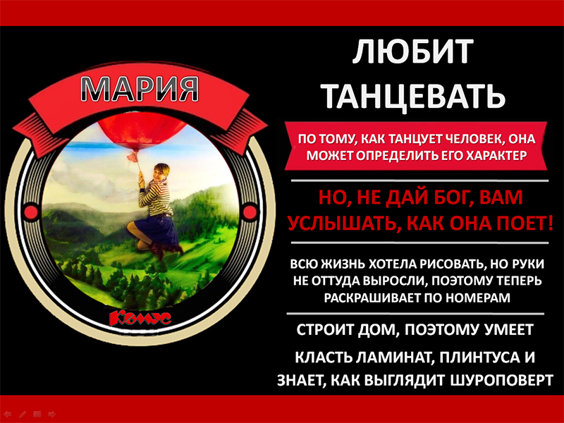 - Веселых работ было много, практически все девушки отнеслись к заданию с чувством юмора. Особенно радовали те, в которых авторы отнеслись к себе с определенной долей самоиронии. В первую очередь это относится к презентации Елены Зверевой. Это была единственная презентация, над которой я хохотала, а не просто улыбалась!